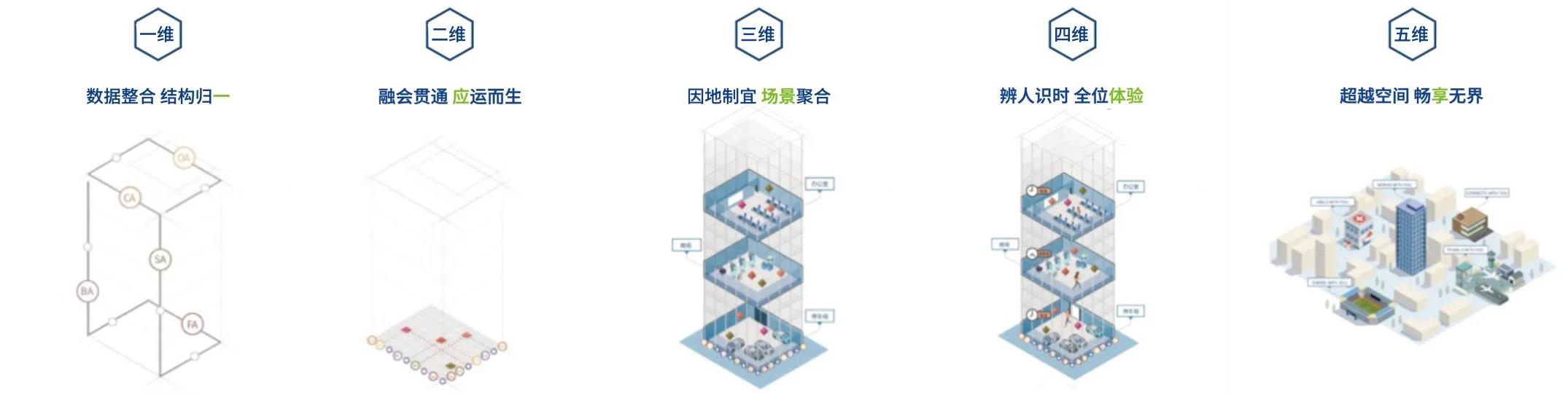 建筑的边界应该仅仅存在于物理世界,在未来的数字世界中,建筑的边界将被模糊,甚至消融。用户追求的是日常跨建筑的整体体验;投资者和运维集团追求的是多资产之间的综合产出;城市管理者关注的则是各建筑在整个社区、城市中的贡献及和谐。数字世界中的五维建筑将超越物理边界,通过数据融合,将建筑的范畴拓展至建筑群、社区乃至智慧社会,将建筑作为一种服务最大化产出,最终实现建筑即服务。