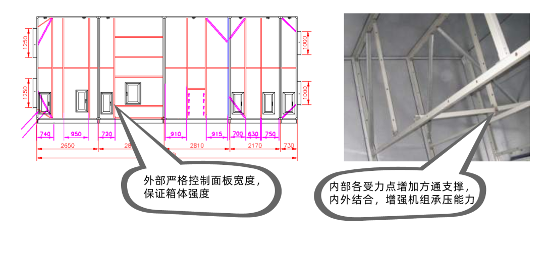 麦克维尔拥有完善的AHU超大机组设计能力、制造能力及测试能力,并拥有权威机构认证的超大风量测试平台(最大可测试30万风量机组)。通过面板多重加强及机组内部加固等方式,使得超大风量机组能在大风量高静压条件下稳定运行,机组漏风、振动、变形等均满足设计标准。