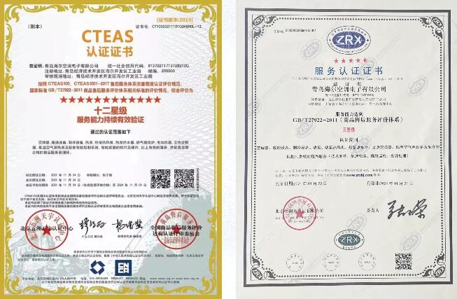 在服务方面,海尔中央空调曾获得过”商品售后服务评价体系五星级认证证书“以及“CTEAS十二星级(服务能力持续有效验证)认证证书“等众多权威认可,展示了海尔中央空调在售后服务方面的卓越匠心和领先实力。