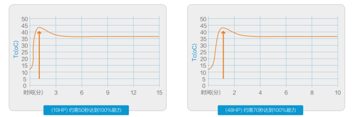 ARV-X7的变频压缩机可超负荷运转,迅速调节至负荷需求点,通过软启动减少对电网的冲击,最快50 秒达到100% 系统能力,制冷制热无需等待,带来卓越的用户体验。