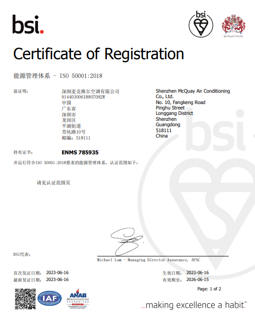 近期,麦克维尔深圳工厂获得《能源管理体系ISO 50001:2018证书》,标志着公司能源管理体系建设取得关键性成果!