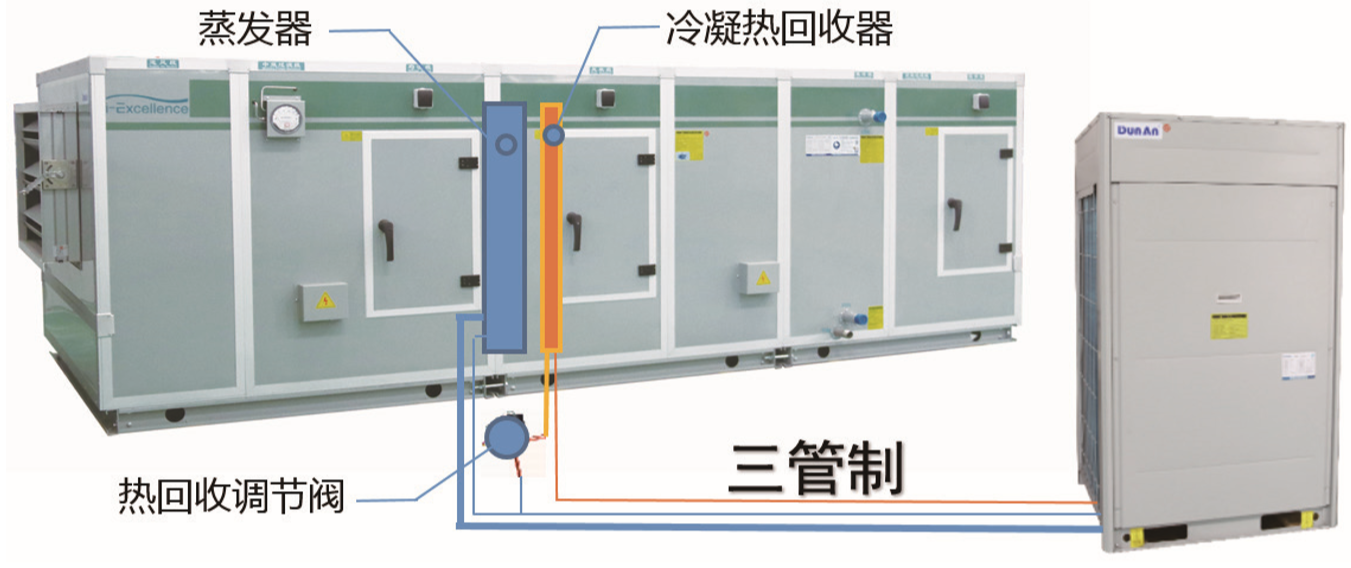 创新的三管制冷凝热回收技术,回收利用室外机制冷除湿的冷凝废热控制机组出风温度,并采用热回收调节阀精确控制再热盘管中制冷剂的流量(热回收量),从而实现出风温度精准控制。
