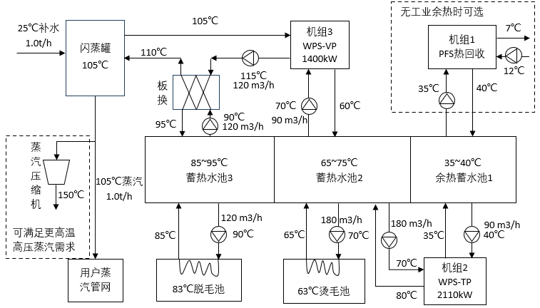 机组3:WPS-VP超高温热泵机组,以蓄热水池2中水为热源,制取115℃超高温热水。一部分热量为蓄热水池3加热,进而为脱毛池提供热源,剩余热量进入闪蒸罐闪蒸后并入用户蒸汽管网。