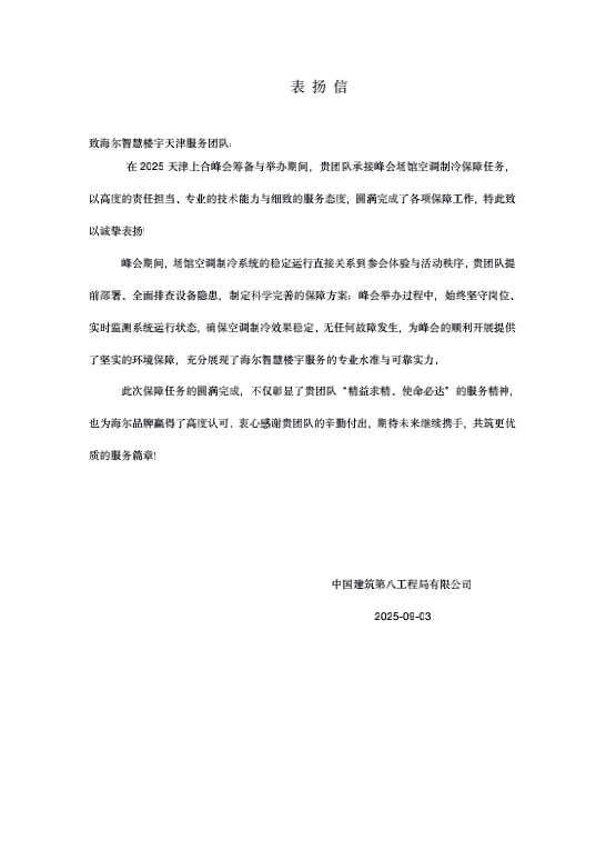 在上海合作组织天津峰会筹备与举办期间,海尔中央空调凭借AI多联机机组维持空调制冷系统的稳定运行,以高度的责任担当、专业的技术能力与细致的服务态度,收获客户对海尔智慧楼宇专业服务与可靠实力的认可。