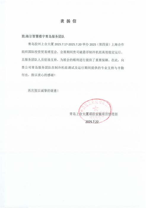 作为2025(第四届)上海合作组织国际投资贸易博览会举办场地,对空调运行稳定性要求极高。会展期间,海尔磁悬浮制冷机组始终保持高效稳定运行。同时,青岛海尔智慧楼宇售后服务小微人员驻场支持,以专业调试将设备的最优一面展示于用户,收获了无限好评。
