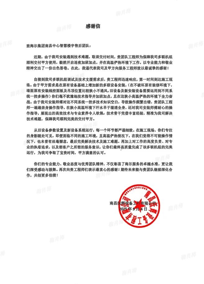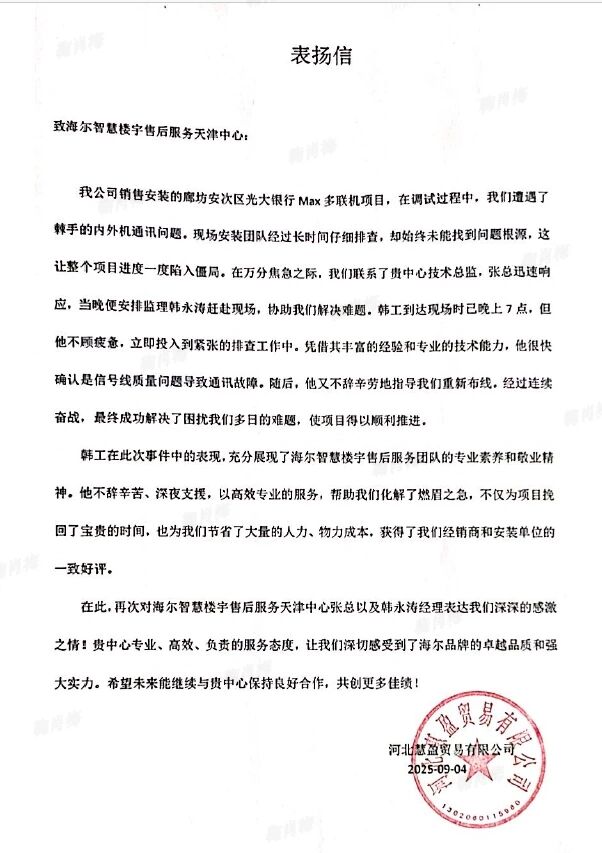 这个制冷季,海尔智慧楼宇售后团队用脚步丈量服务温度,用技术诠释品牌承诺。虽然制冷季即将结束,但海尔人的服务热情永不降温,将继续以用户需求为中心,创造更多感动时刻。