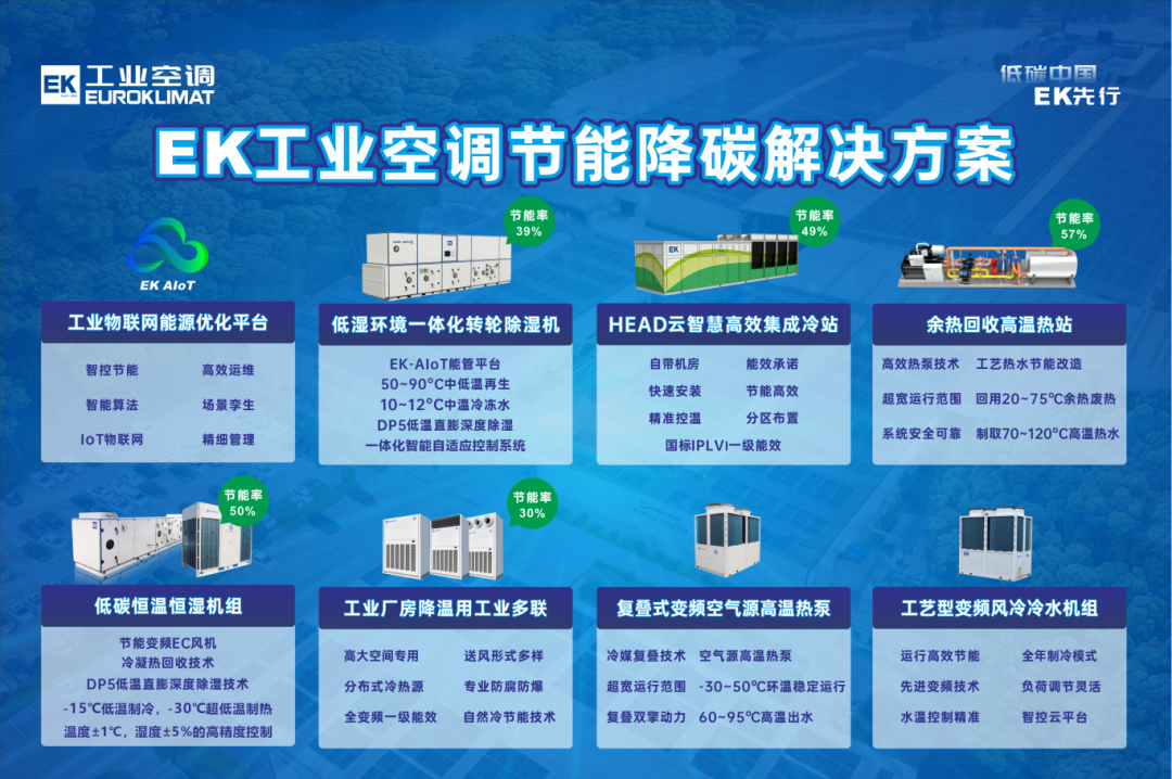低碳中国,EK先行!自1963年成立至今,EK工业空调始终秉承以技术创新为动力、以节能环保为导向的理念,致力于成为节能低碳能源系统专家。基于“节能&低碳”“工程产品化”“数智化运维”三大核心战略,EK工业空调为零碳工厂建设提供全方位的暖通空调解决方案。针对行业痛点,EK工业空调打造覆盖工业冷热源、工业高温热泵、工业环境控制及工业氟系统等多领域的节能产品矩阵,可提供EK-AIoT工业物联网能源优化平台、HEAD云智慧高效集成冷站、HP120工业高温热泵、DP5一体化高效转轮除湿机、工业多联等专业、高效、智能的低碳解决方案,全方位满足客户的多样化需求。