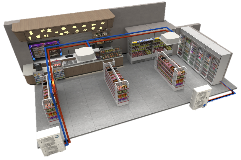 便利店虽面积不大,但密闭空间内冷柜、灯光等设备发热量大,高额电费也成为运营中一大难题。海尔智慧楼宇采用FAST系列搭配冷凝机组,在有限空间内实现高效制冷;机组1级能效、全直流变频的高效节能特性,也为商家充分节省了运营成本。