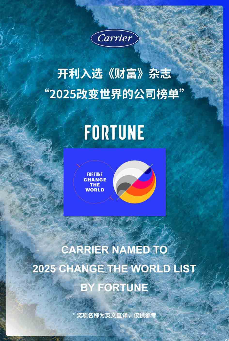 开利荣幸入选《财富》(Fortune)杂志“2025改变世界的公司榜单”,这是对开利长期以来将可持续发展融入企业基因、通过创新节能技术应对全球气候挑战的充分肯定。