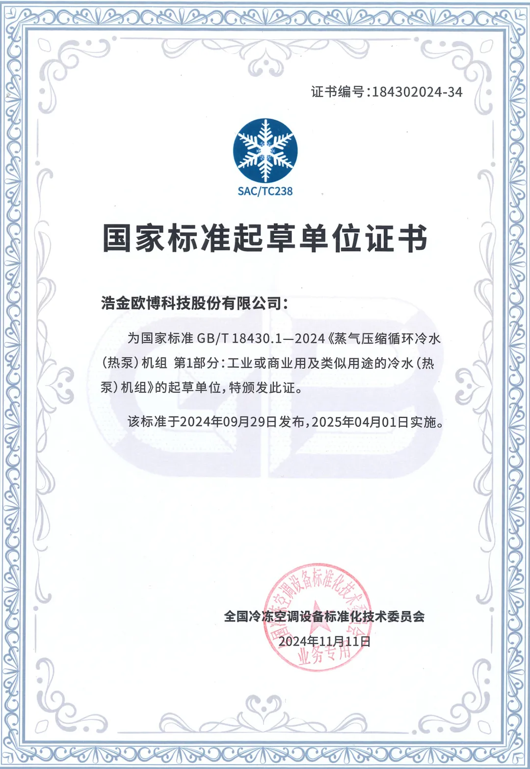 参与起草的国家标准《蒸气压缩循环冷水(热泵)机组 第1部分:工业或商业用及类似用途的冷水(热泵)机组》获得正式发布,让欧博的身影融入行业发展的脉搏;