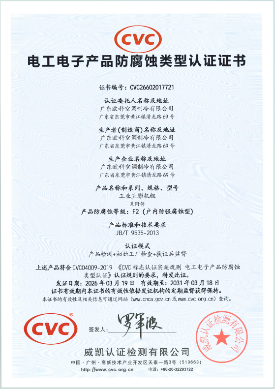 近日,EK工业多联机组通过行业权威机构腐蚀试验:二氧化硫气体腐蚀试验验证,正式获得F2(户内防强腐蚀型)防腐蚀认证证书和WF2(户外防强腐蚀型)防腐蚀认证证书,标志着EK工业空调突破技术壁垒,在高湿度、高盐雾、化学腐蚀这类恶劣环境的应用中更上一个台阶。