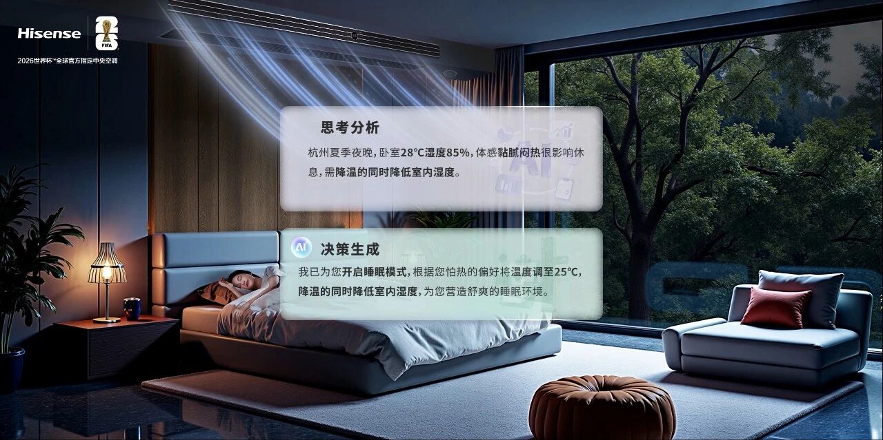 尤为值得关注的是,ThinkAir2.0在空气健康上再度升级,集成Ai家IIPRO丰富的设备资源,融合星海大模型能力与海信中央空调数十年在空气领域的专业沉淀,成功实现了“感知-思考-决策-执行”全链路闭环的空气智能体——AI空气健康管家。依托这一核心能力,它能实时捕捉室内各类空气数据,3秒极速响应,24小时全天候主动调控,无需手动干预,始终维持室内空气最佳状态。