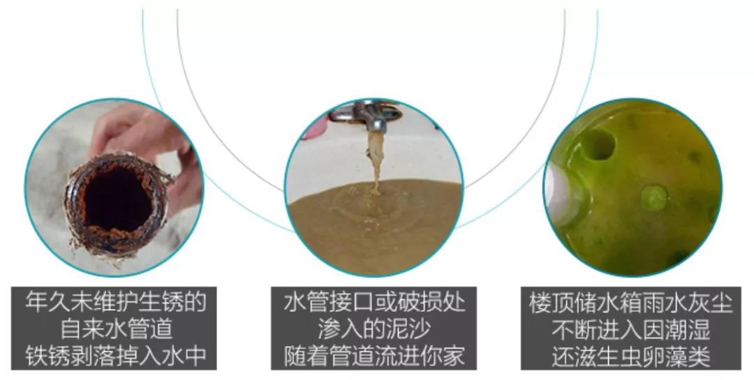 家庭中的自来水在出厂的一瞬间是符合国家生活饮用水标准的,但是在通过管道运输到每家每户后,途中运输管道生锈、小区管道老化、外界污水污染等情况会造成水源二次污染问题。