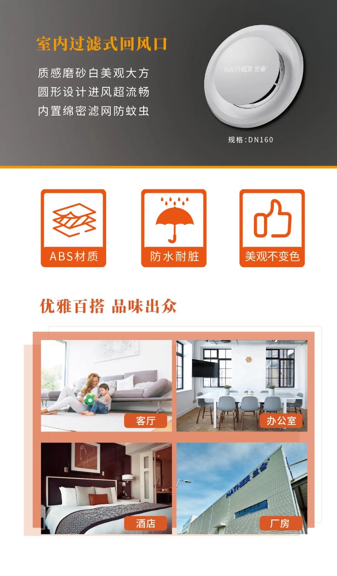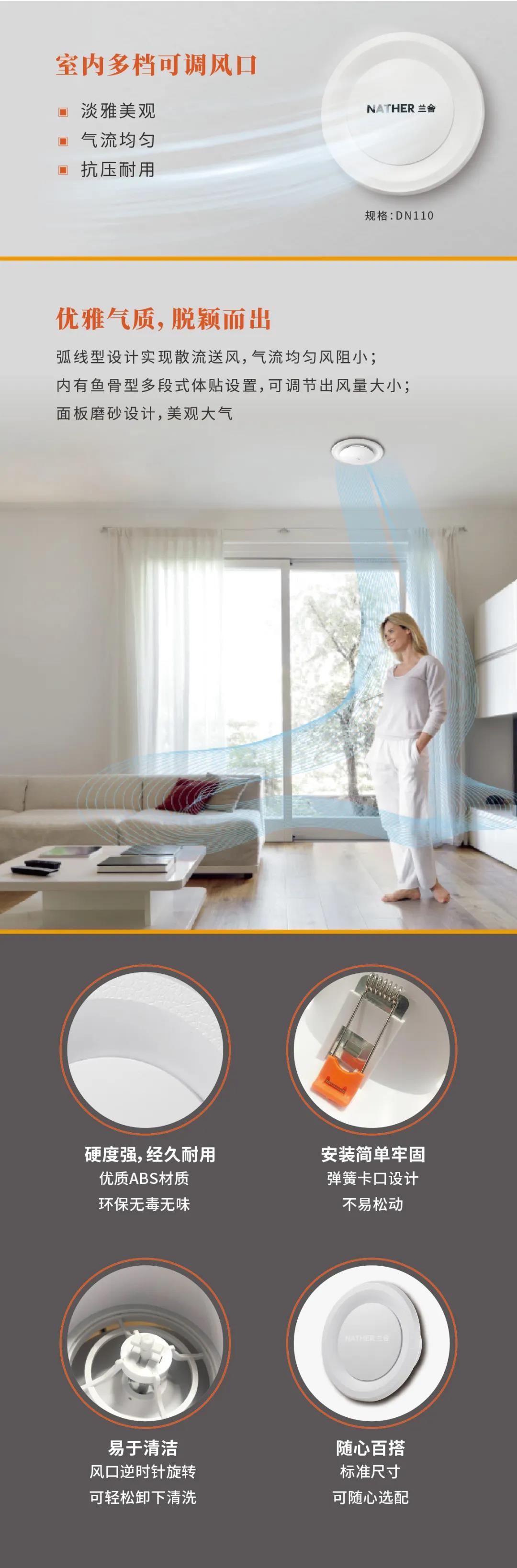 只有工艺精湛风口才能配得上精湛新风系统。要设计一款气流均匀,牢固耐用、低噪音、美观兼具风口,并不是简单的事。兰舍多档可调风口和过滤式回风口做到了,严挑细选防水耐脏ABS材质,巧妙弧线型设计恰到好处的均匀分散气流,赋予它优雅外观及低调奢华气质的同时,成功加入了更多贴心功能。