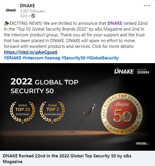 日前,全球知名科技媒体a&s《安全自动化》发布2022年“全球安防50强”企业排行榜单,狄耐克跃居第22位,参选Intercom企业中位列第2名,首次跻身全球安防50强企业行列。