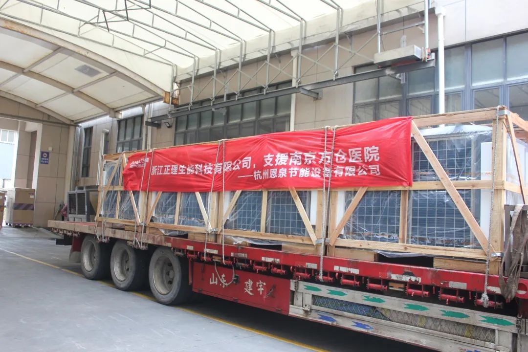 生能公司也是第一时间安排发货,将12台生能空气源热泵热水机从公司发出,直达南京国际博览中心方舱医院现场,全力驰援防疫一线。