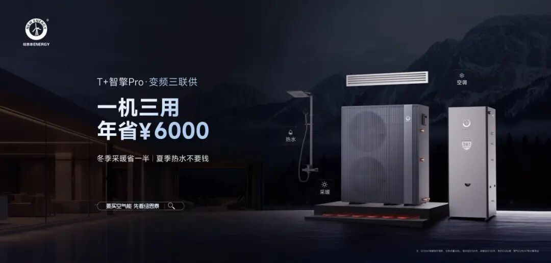 还有一种是“三联供”,也就是提供采暖、制冷、生活热水三种功能的系统。目前这类产品相对不多,比如纽恩泰空气能的三联供产品T+智擎Pro就是其中之一,冷暖双强,夏季热水免费用,搭配四个一级能效,一年能省6000元。