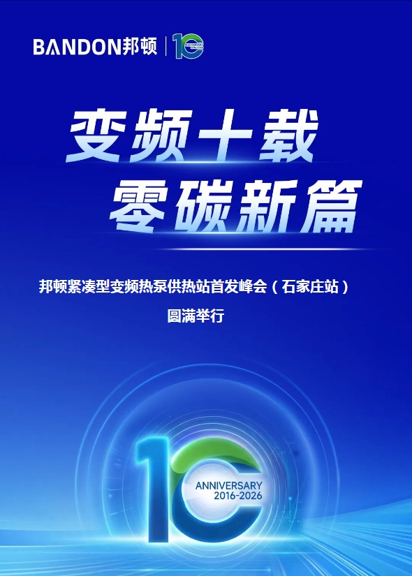 新十年磨一剑,今朝试锋芒。2026年4月10日,石家庄,一场关于清洁供暖、变频技术与零碳未来的行业盛会,在石家庄希尔顿酒店如约绽放。“变频十载·零碳新篇”——邦顿紧凑型变频热泵供热站首发峰会(石家庄站)圆满落幕,100多位行业领袖、技术先锋与合作伙伴共聚一堂,见证邦顿十年变频之路的新起点。