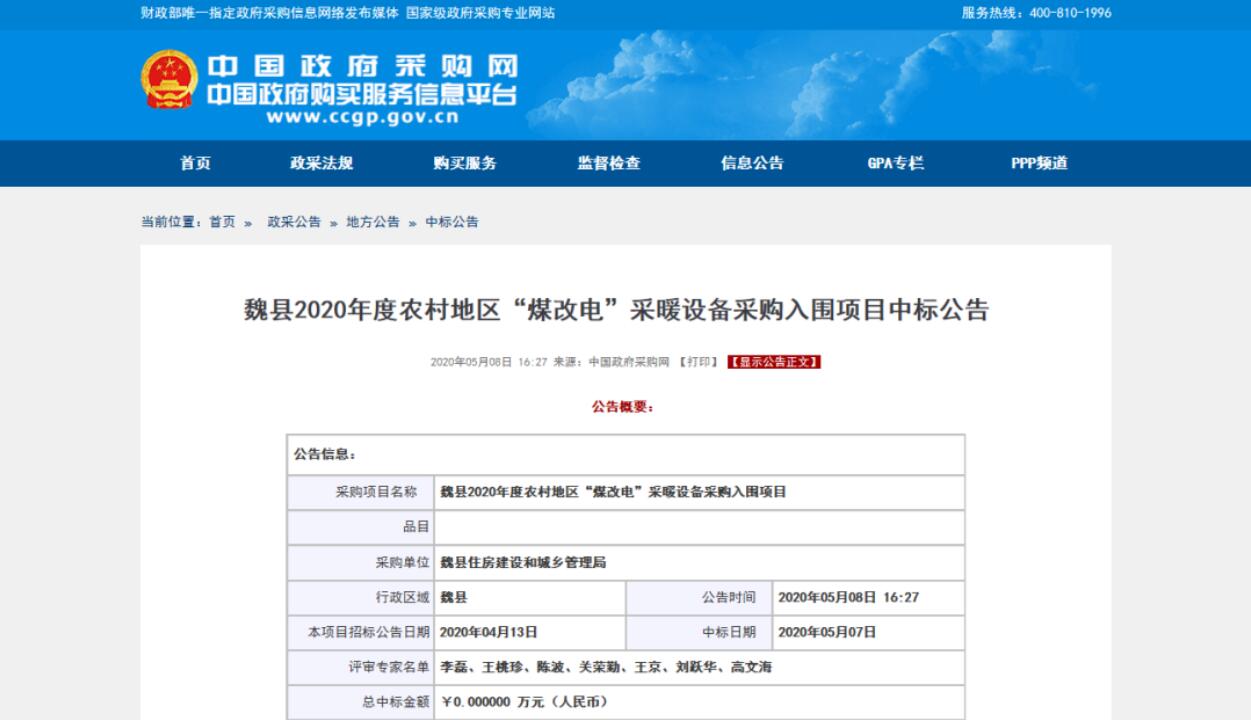 项目名称:魏县2020年度农村地区“煤改电”采暖设备采购入围项目
