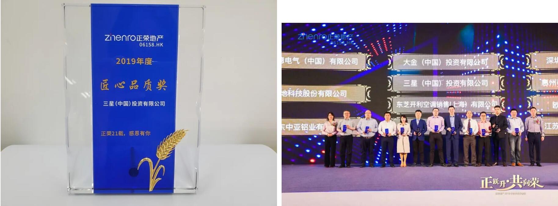 2019年,正荣地产合作伙伴会议在上海盛大召开,三星中央空调凭借雄厚的技术支撑,秉承三星一贯追求不断突破革新的理念,荣获“年度匠心品质奖”。这不仅是对三星中央空调产品的认可,也证明了三星品牌的实力。