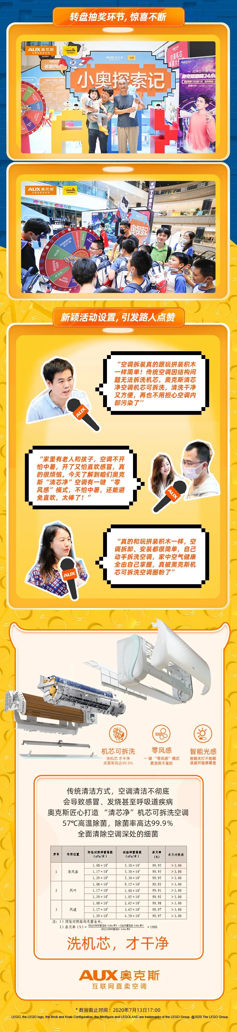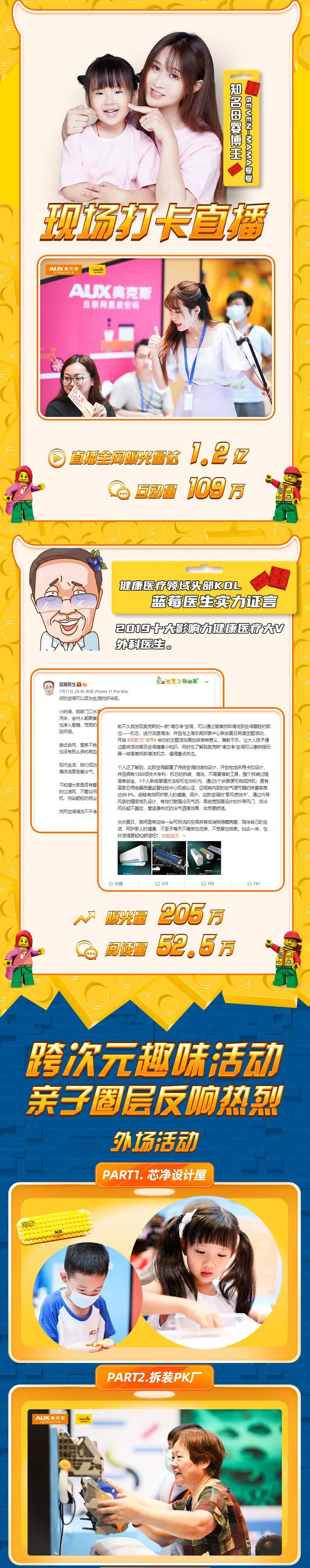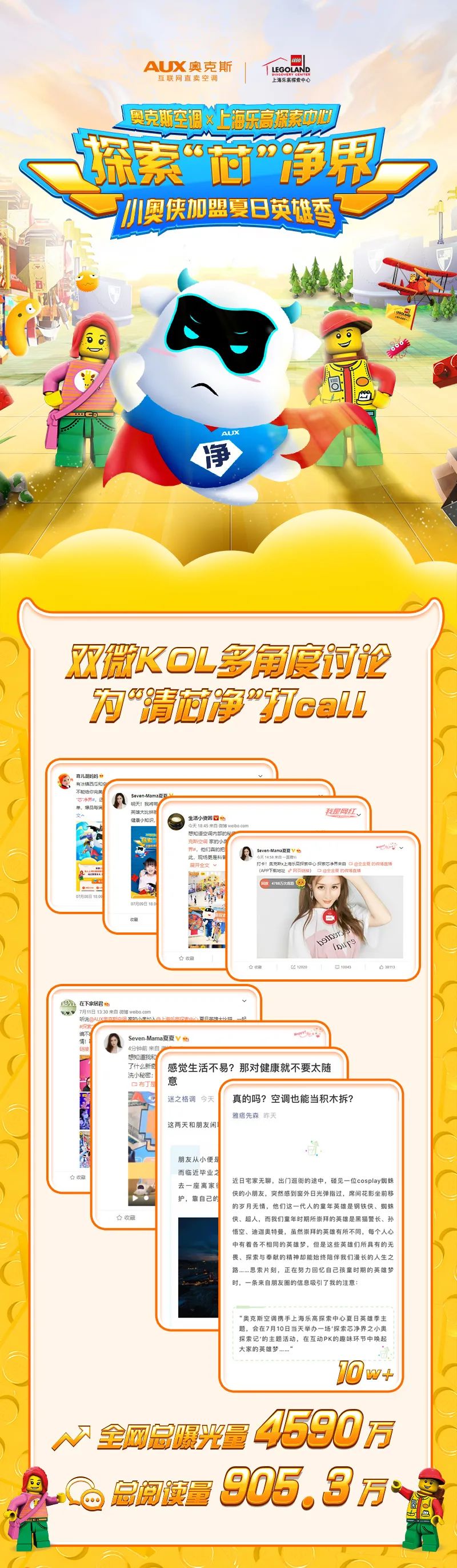 7月10日,“探索’芯’净界”奥克斯×上海乐高探索中心夏日英雄季火爆落幕,为所有人带来了一场实至名归的“清芯”之旅。活动当天,KOL @生活小资圈、@雅痞先森等纷纷发文为其打call,双微全网总曝光量达4590万、总阅读量达905.3万;在上海乐高探索中心活动现场,超100对亲子参与活动,主播@Seven-Mama夏夏 现场打卡直播,全网曝光量达1.2亿、互动量超109万;除此之外,本次活动还吸引了 @蓝莓医生的关注,奥克斯清芯净易拆洗、更健康的功能获得了他的高度认可……