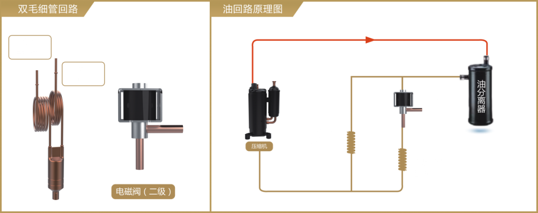 而卿睿采取双毛细管的回油配置,一级回油毛细管(常规)难以应对恶况时,二级回油管路(辅助)电磁阀可自动识别并及时开启,为压缩机源源不断提供润滑液,保证空调平稳运行,拒绝管路堵塞。