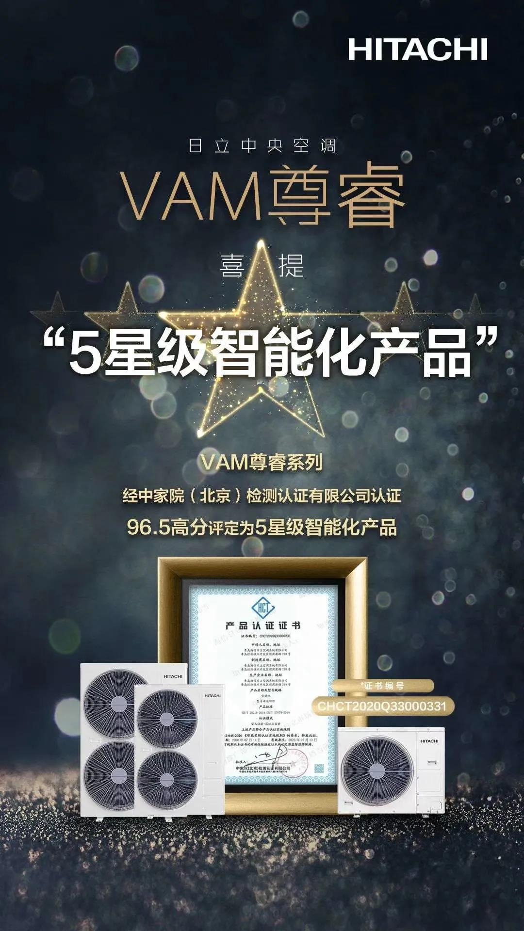 近日,日立中央空调VAM尊睿以96.5的高分一举拿下行业权威认证机构中家院智能空调指数星级认证——5星级智能化认证!