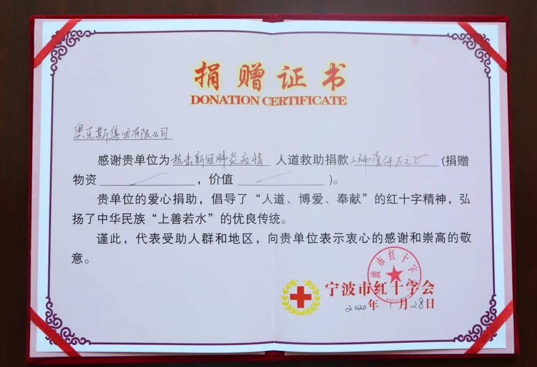 2020年抗击新冠肺炎,奥克斯集团向宁波市红十字会捐款1000万元,同时第一时间从海外采购并捐赠口罩32万余只,在海外疫情爆发时,又向海外捐赠口罩25万余只;