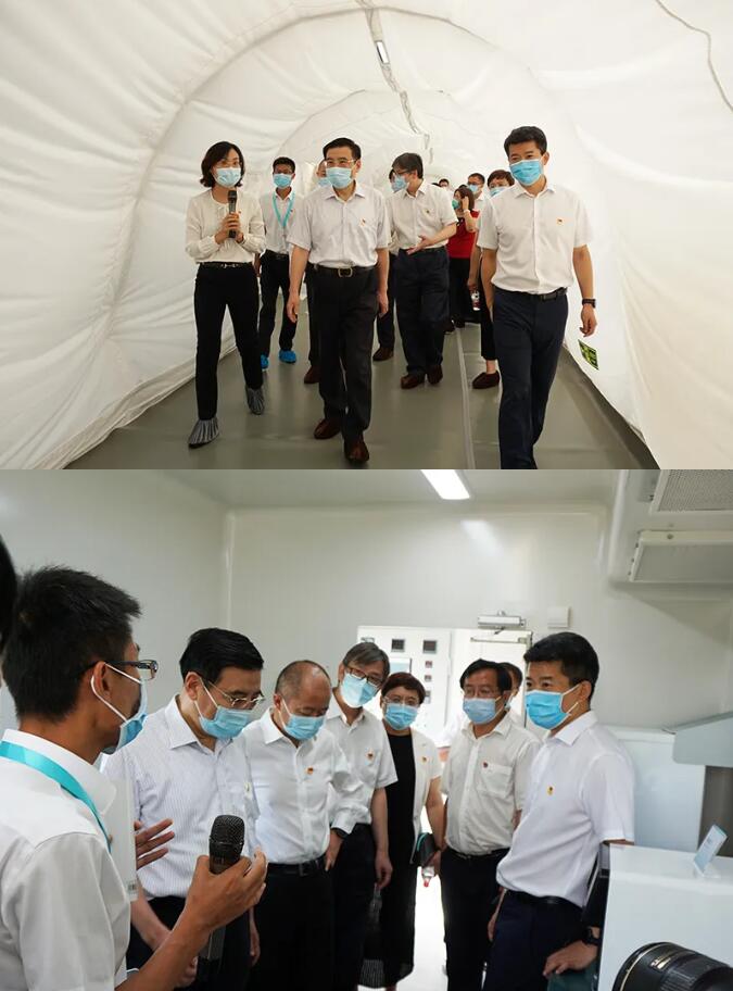 苗圩一行参观了在户外展出的模块化负压方舱医院、集成式PCR实验室、社区发热哨点、负压隔离病房、P2+方舱移动生物检测实验室等装备和产品,给予高度肯定,并仔细询问性能、供应链、产能等情况。