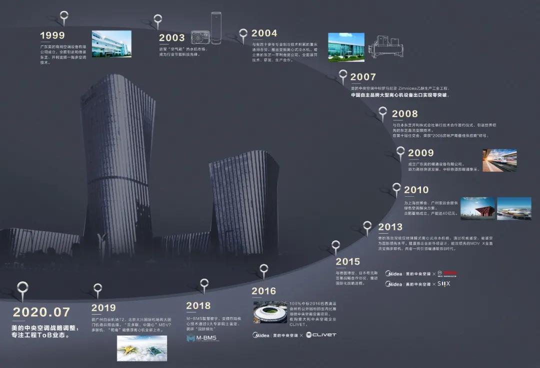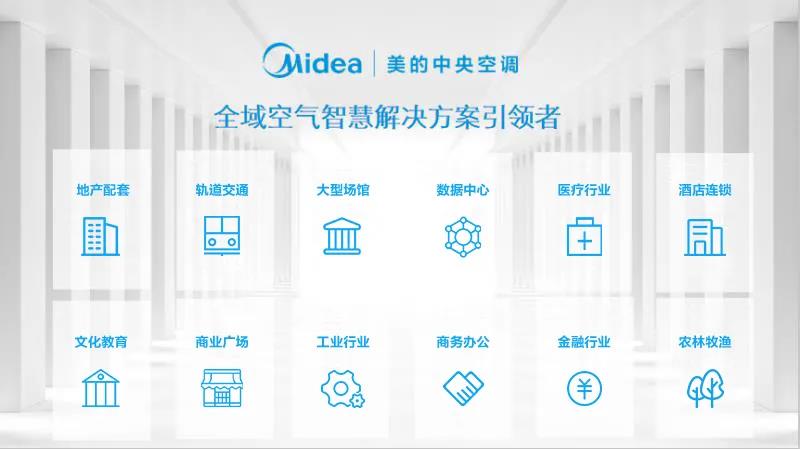2020年7月,美的中央空调业务战略调整,专注工程(ToB)业态,深耕房地产、酒店连锁、轨道交通、数据中心、医疗卫生、农林牧渔、文化教育、大型场馆、商业办公等应用场景及行业,用专业系统解决方案拓展更多的工程领域。