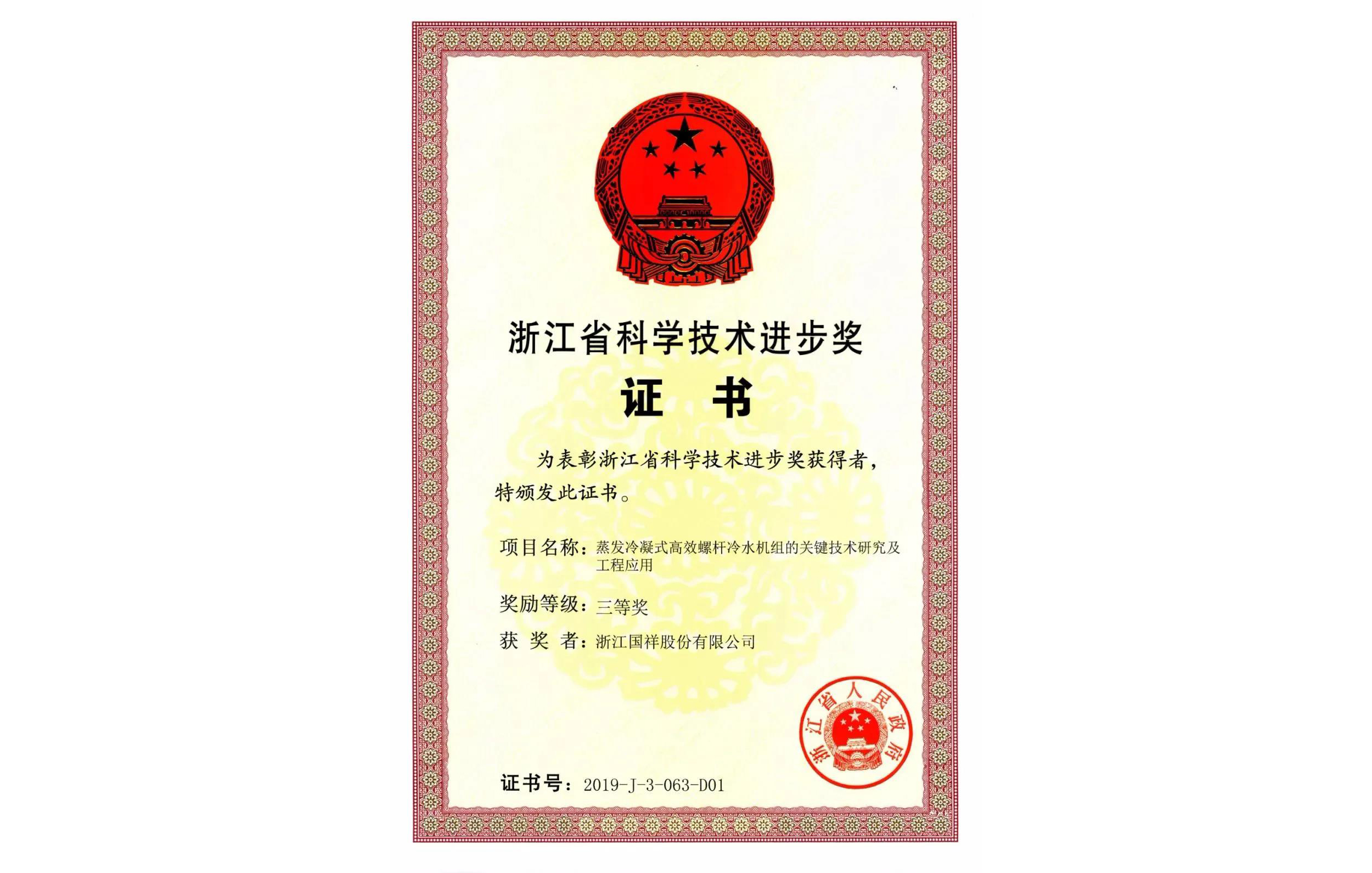 国祥蒸发冷关键技术研究及工程应用获浙江省科技进步三等奖