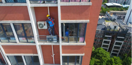 熊太保正在高空作业,安装空调外机