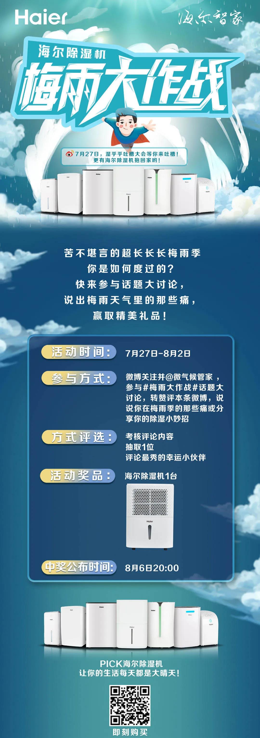 海尔除湿机强效除湿,控制室内湿度,有效预防霉菌产生,还给你一个舒适清爽、健康美好的睡 眠环境!除了影响睡眠问题和海尔除湿机这个神奇法宝,你一定还有很多没说出口的痛,还有很多搞定潮湿的小妙招,那就来@微气候管家 和 @海尔空调 官方微博,参与#梅雨大作战#话题大讨论吧!还有机会赢取超级大福利哦!7月27日-8月2日,准时上车,Hold住“霉”雨季,把大奖抱肥家!