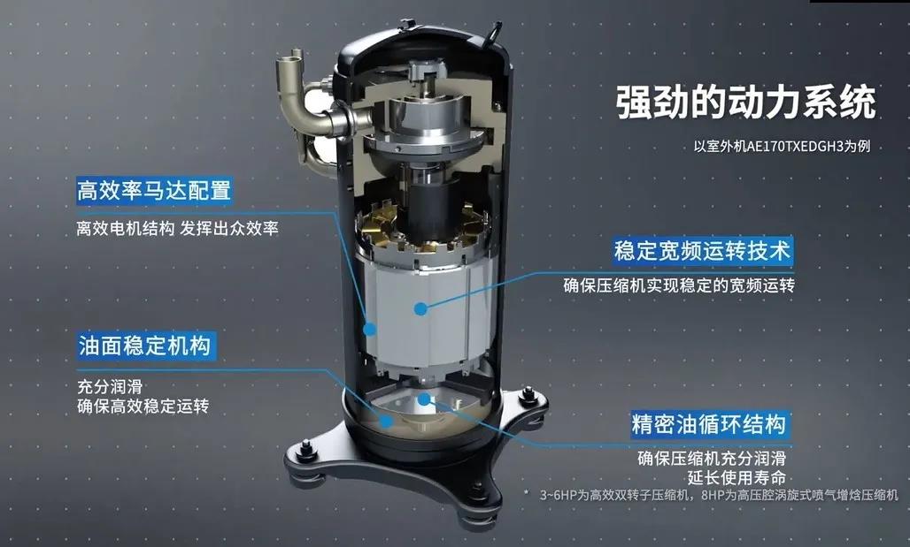 与此同时,可实现超低温制热,适应大部分地区恶劣的运行工况,同时凭借三星自主研发的高压腔涡旋式喷气增焓压缩机,超精密加工的不对称涡旋盘,实现压缩机进气连续,增焓技术可使系统在严寒气候下提升制热能力,结合板式换热器的二级过冷系统,有效减少制冷剂的压力损失,同时室外机底盘可根据除霜情况与外气温度智能除冰,防止化霜水凝结。