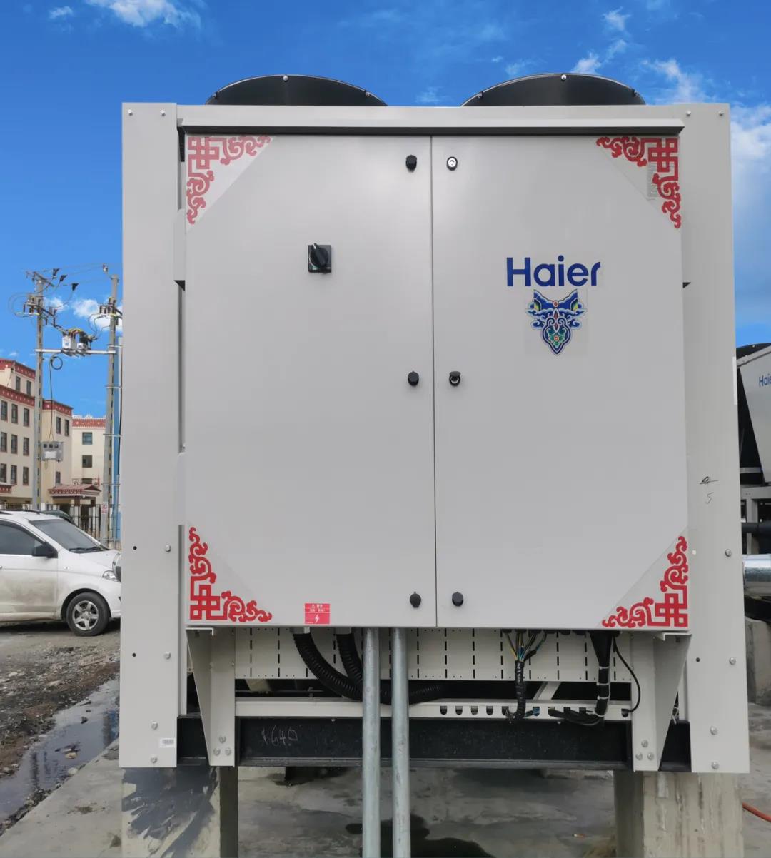 在果洛州两家医院服务的海尔超低温双级压缩风冷螺杆空气源热泵机组,被贴上了当地特有的藏式花纹,成为了蓝天之下另一道靓丽的“风景线”。