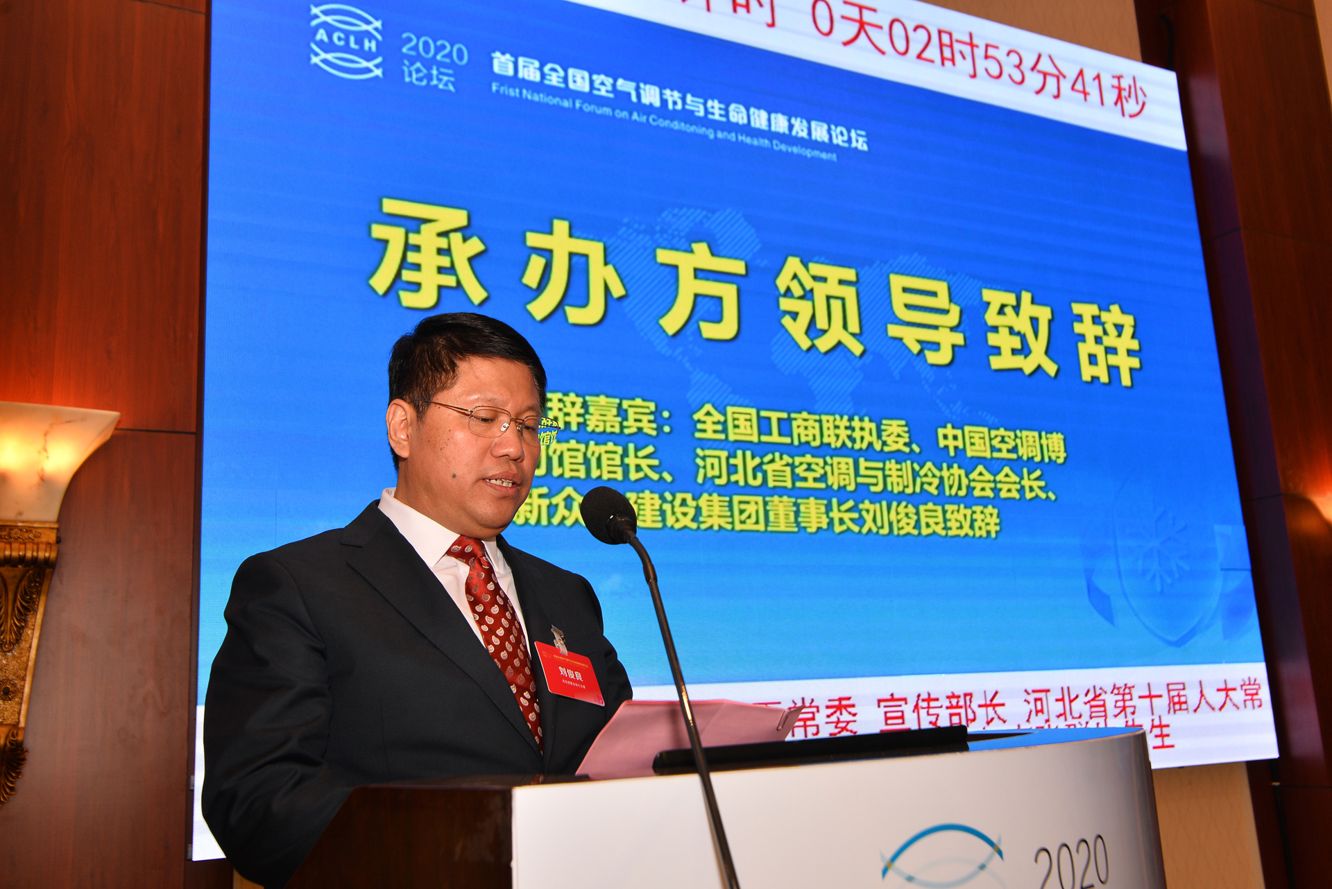 图为:承办方领导全国工商联执委、中国空调博物馆馆长、河北省空调与制冷行业协会会长、新众业建设集团董事长刘俊良先生致词