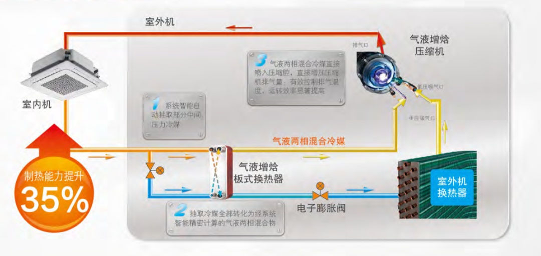气液增焓技术通过抽取部分中间的压力冷媒,在主循环增大过冷度提高热交换效率的同时,显著增加了压缩机的排气量,也有效抑制了排气温度过高,使系统在严寒气候下制热能力提升。