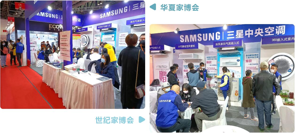 华夏家博会是家装家居行业最大规模的线下消费展,先已举办展会超百场,累计服务750万装修业主的家,而世纪家博会则是以家装、建材电子商务平台为一体的专业展会,作为家博会的老朋友,三星中央空调一如既往的用高质量的产品回馈广大用户。