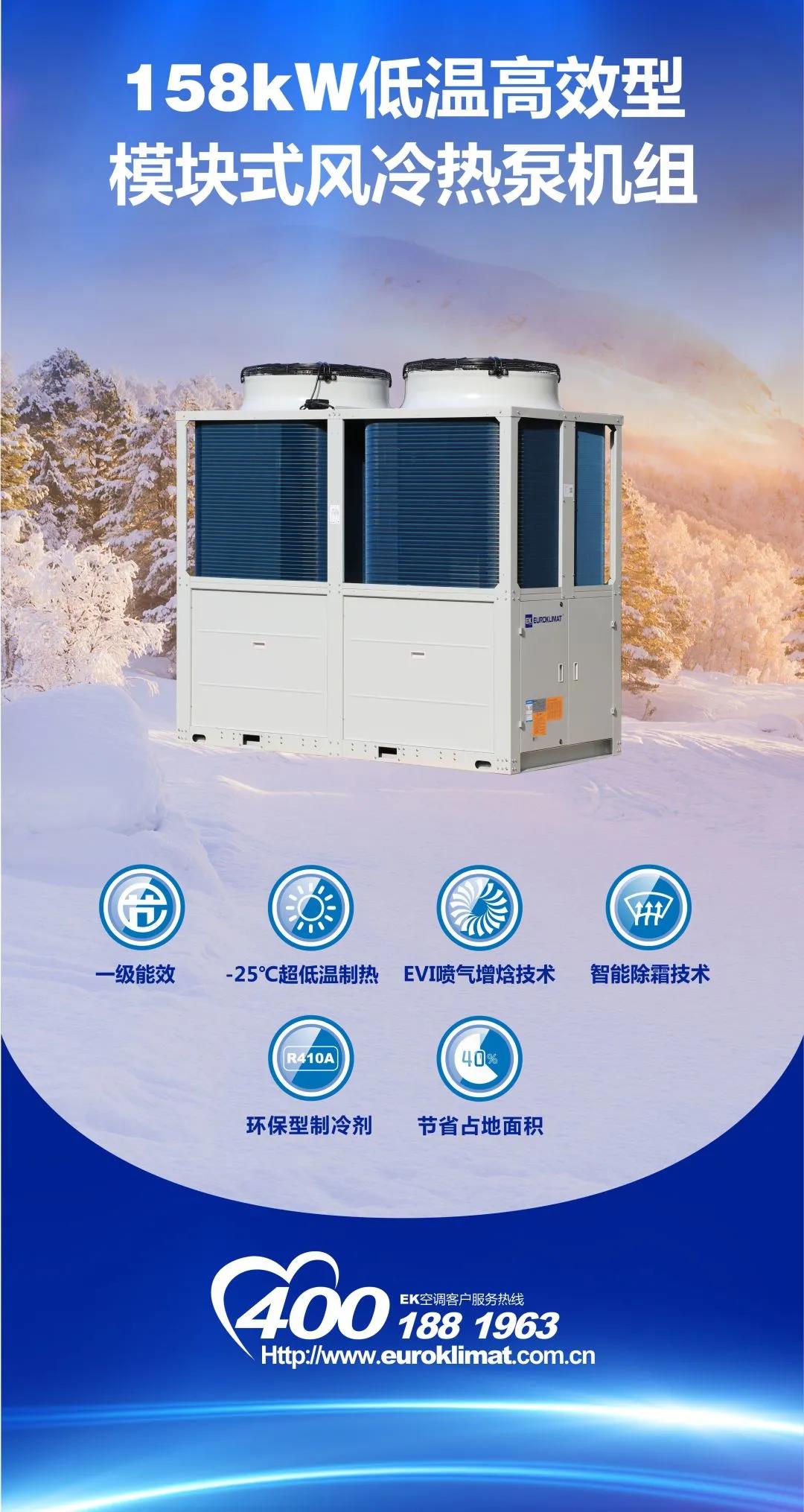 项目应用在科研室、办公楼等科技基础设施,当地冬季极端气温在-19℃,制热量达5688kW。因此采用在-25℃的极端工况运行的EKAC500BR1LH低温高效型模块式风冷热泵机组36台。