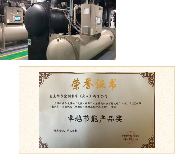 此次项目更新改造采用了3台高效变频离心机、3套冷凝器在线清洗装置,并通过全过程智能控制系统使得节能率达32%,用实际运行数据获得了“中国建筑科学院和暖通杂志”举办的“蓝天杯”高效机房节能产品奖,也彰显出麦克维尔在行业中高效节能的品牌实力。