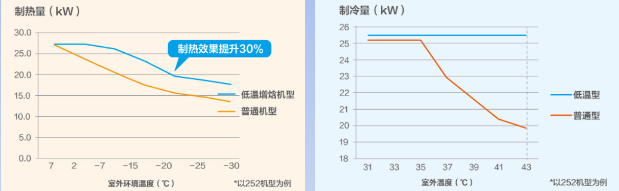 海尔物联多联机MX-I无限冷暖系列可实现-30℃~55℃宽范围运转,机组采用喷气增焓压缩机,可使冷媒循环量提高15%,机组效率提高5%,冬季最低可实现-30℃制热,低温制热性能强;夏季55℃高温制冷,无惧极限天气挑战,确保制热制冷效果。