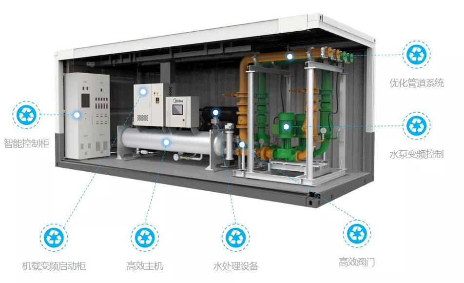 美的数据中心高效温控系统解决方案目前已成功应用在深圳鹏城云脑Ⅱ、中国移动(江苏苏州)数据中心、鹤山蔚海智谷等行业标杆建筑。鹤山蔚海智谷数据中心是华南地区最大的IDC产业园。美的暖通与楼宇为该项目提供的变频直驱离心机组,综合能效IPLV从行业平均水平的7.5提升到10.69,适用于多工况下高效运行,赢得了运营方的一致好评。
