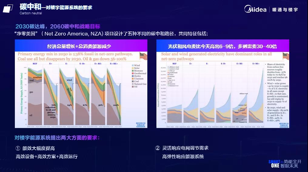 美的集团暖通与楼宇事业部先行研究高级工程师丁云霄在研讨会上分享了《楼宇能源碳中和解决方案》。在碳中和背景下,楼宇能源系统的两大方向是:1、楼宇能效需要大幅度提高,因此需要高效设备+高效方案+高效运行;2、需要灵活响应电网调节需求,高弹性响应能源系统。美的打造的楼宇能源解决方案,通过因地制宜负荷优化匹配设计和高效设备高效运行,能实现30%以上综合节能效果,助力楼宇建筑可持续发展。
