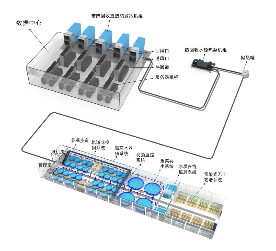 同时,数据中心余热由直接蒸发冷却通风AHU机组进行回收,经过螺杆水源热泵将热量进一步转化为可被使用的高温热水,实现为生态农业供热或空间供暖,该系统余热回收率最高可达100%,达到抵消碳排放的效果,实现相对的“零碳排放”。
