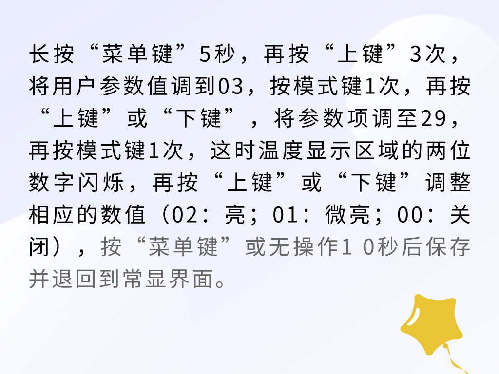 在晚上睡眠时间,温控器上显示的工作状态,就会发出光,会影响睡眠,这时,您可以设置“关闭待机背光亮度”。