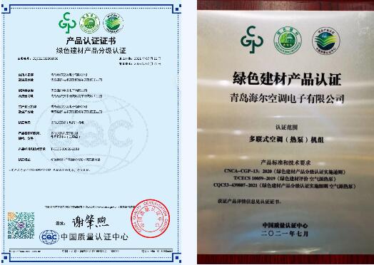 海尔物联多联机荣获中国绿色建材产品三星级认证!