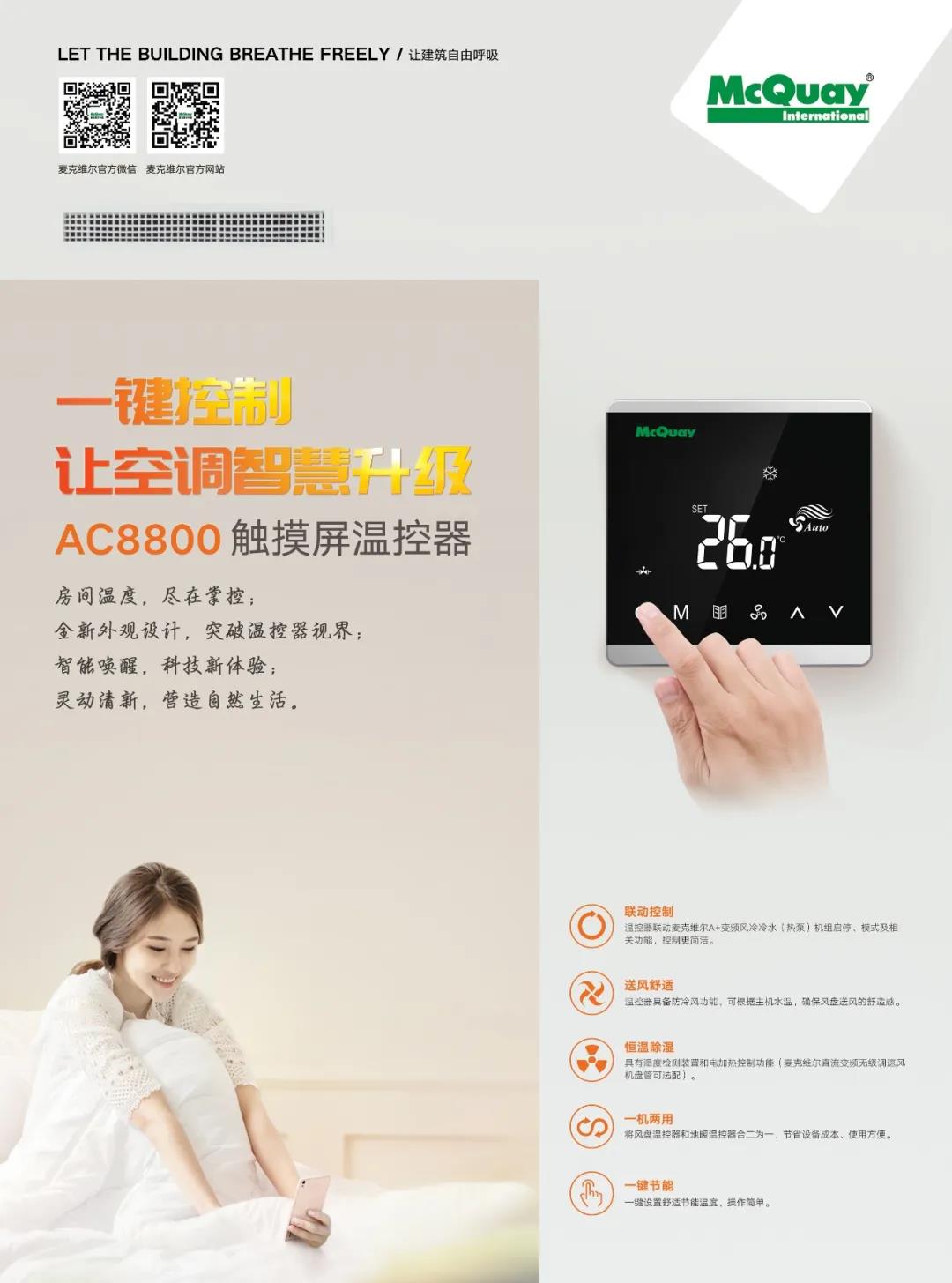 AC8800可以一键设置节能模式,自动设定制冷模式或制热模式下的温度,无需手动调节。适用于政府单位、园区办公等公共区域,充分彰显节能环保理念。