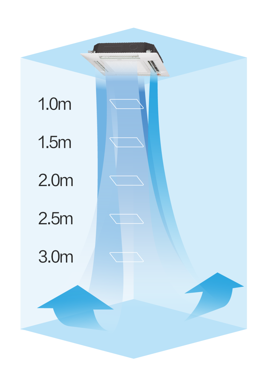 海尔商铺空调内机标准出风高度可达3m,四面立体送风,且出风强劲,可将冷暖风直接输送到地面。