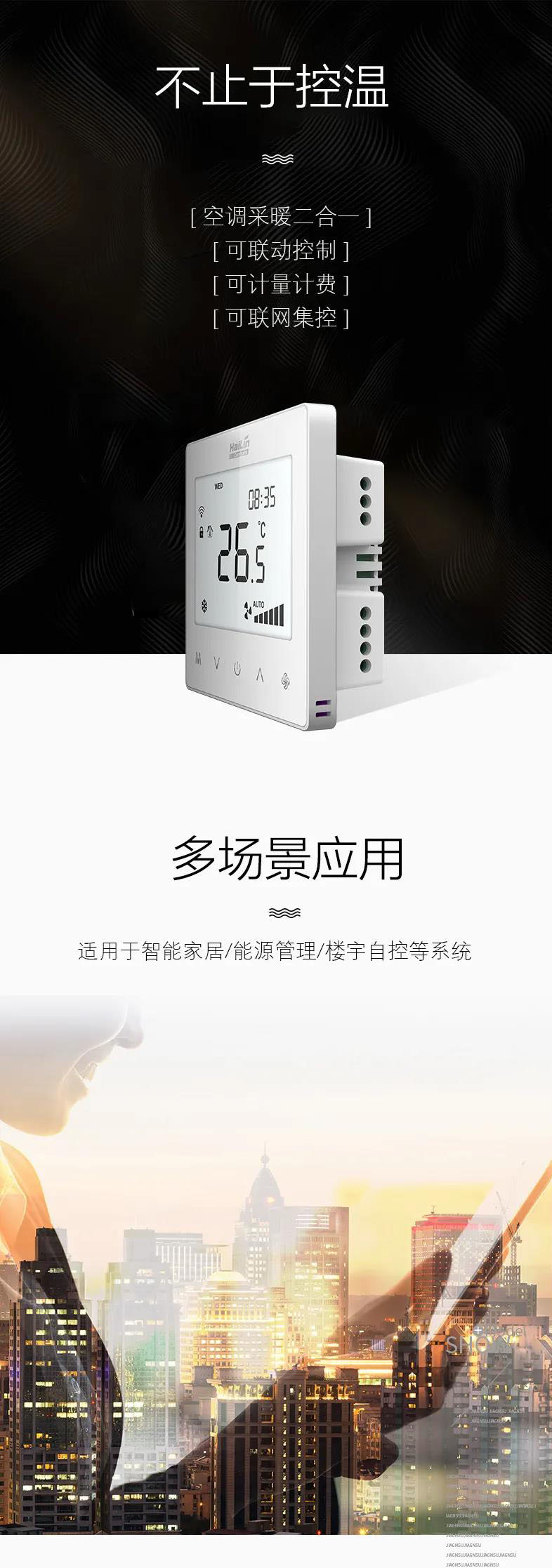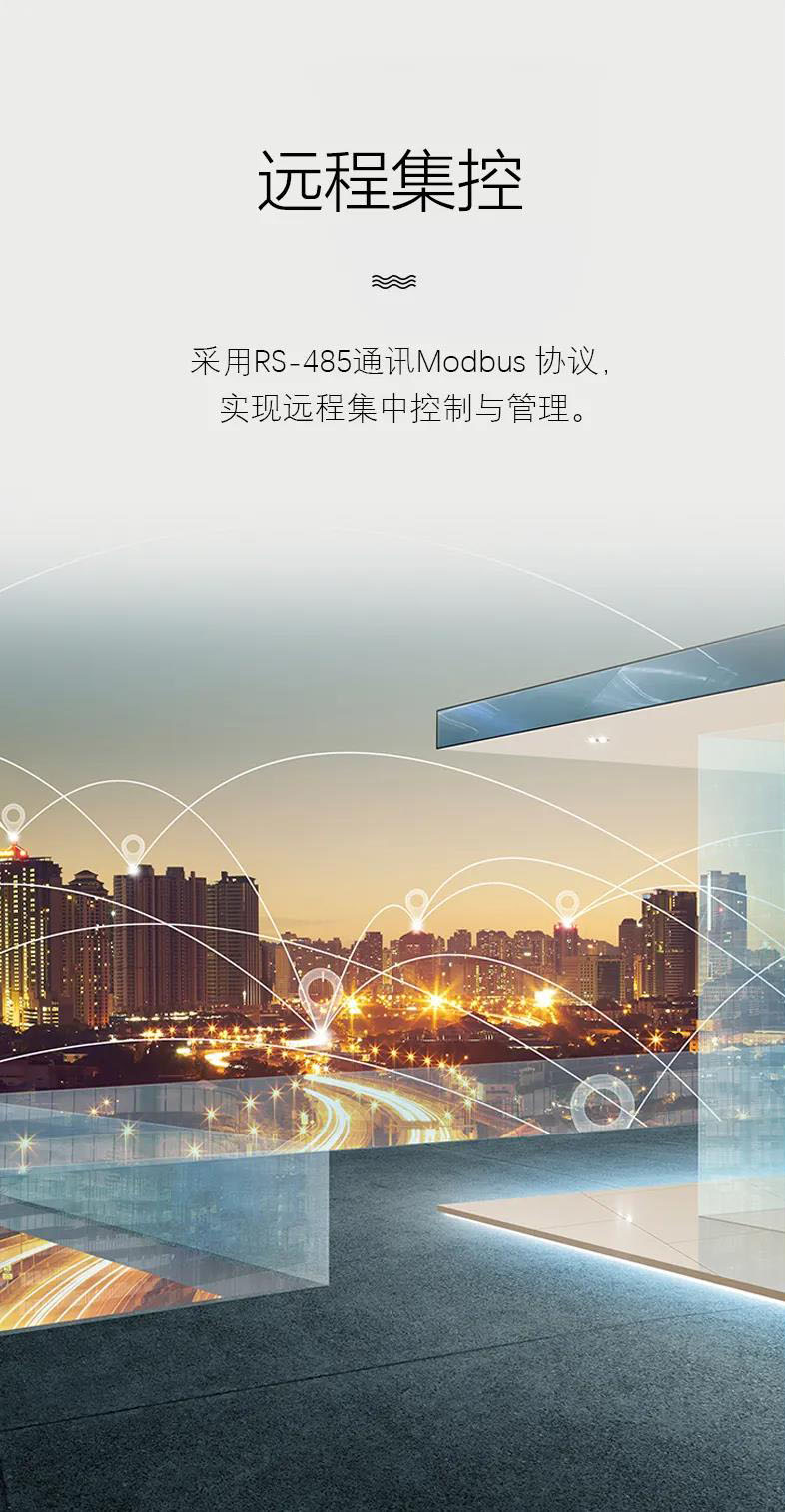 产品采用 RS485 通讯方式,实现远程集中控制与管理,并且通过监测风机和阀门的运行状态,实现对空调的计量计费功能,尤其适用于办公楼、商场、写字楼、 公寓、住宅等项目使用。