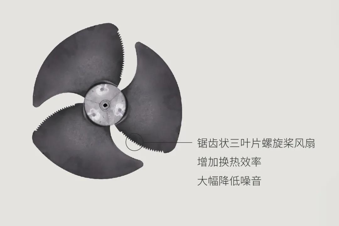 外机换热需要大风量持续排风,风扇的结构如果不合理,会在高速运转中产生较大的震动音,并且影响电机的寿命。